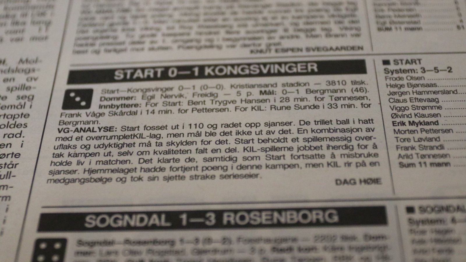 Denne ene siden med VG-børs fra denne mandagen forteller en haug av gode KIL-minner. Det hjalp Start lite at hjemmelaget visstnok dominerte kampen stort. Erik Holtan og KIL-forsvaret holdt nullen da Start sløste. Myggen Mykland dominerte stort på midtbanen og ble kåret til kampens beste spiller med 8 poeng på VG-børsen. For innsatsens var han med på Ukens VG-lag der det ikke var noen KIL-spiller med. Keeper Holtan ble kåret til KILs bestemann og fikk 6 poeng på den samme børsen. KILs lag i denne kampen så slik ut: Holtan, Martinsen, Sanderud, Berstad, Tran, Karlsrud, Daløkken, Risnes, Francis, Kaasa og Bergmann (Sunde).