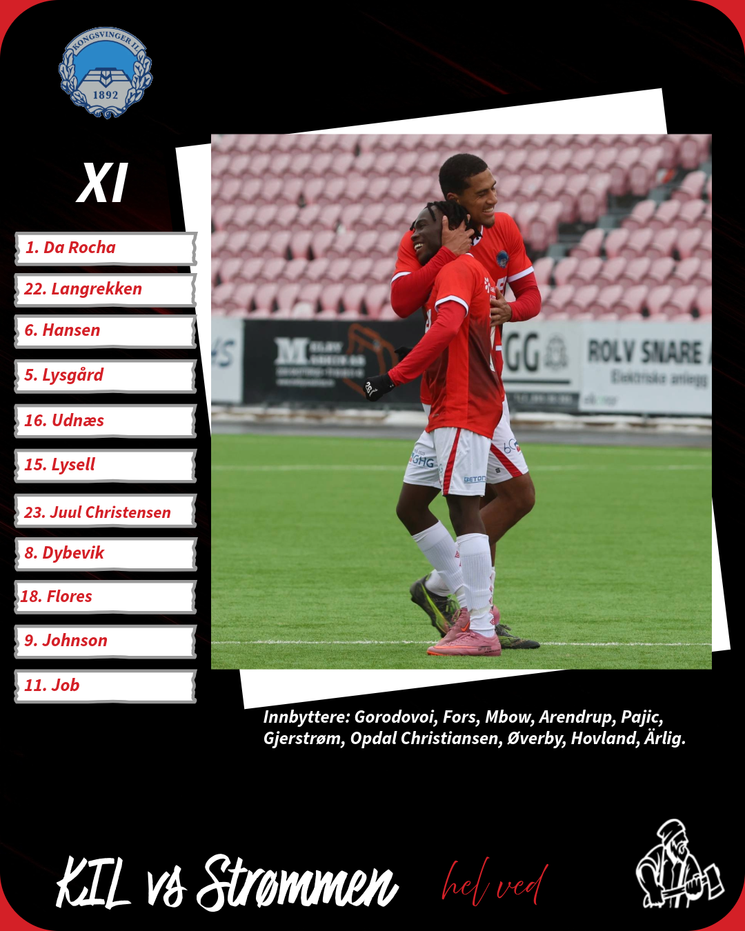 Slik stiller KIL: William Da Rocha - Ludvig Langrekken, Adrian Hansen, Daniel Lysgård, Herman Udnæs - Vetle Lysell, Frederik Juul Christensen, Andreas Dybevik - Markus Flores, Gabriel Johnson, Daniel Job.