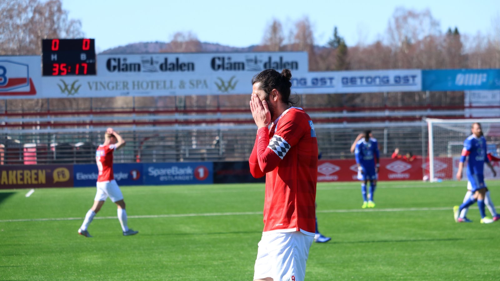 31.min.: KFUM alene gjennom i midten. Våre stoppene jobbe den utrolig nok opp og det blir corner med påfølgende feilberegning av Ali Ahamada. En farlig heading reddes på streken av Christian Røer.