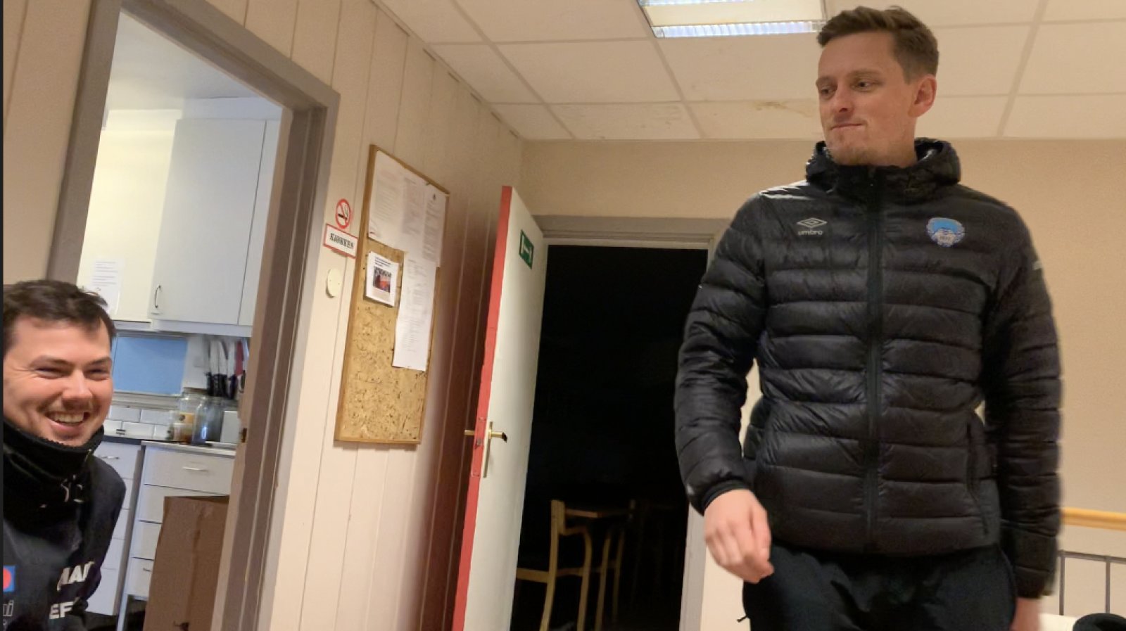 De to trenerne Johan Wennberg og Magnus Erga satt og diskuterte kampen inne på klubbhuset, men slapp ikke unna da kameraet kom snikende. Video
