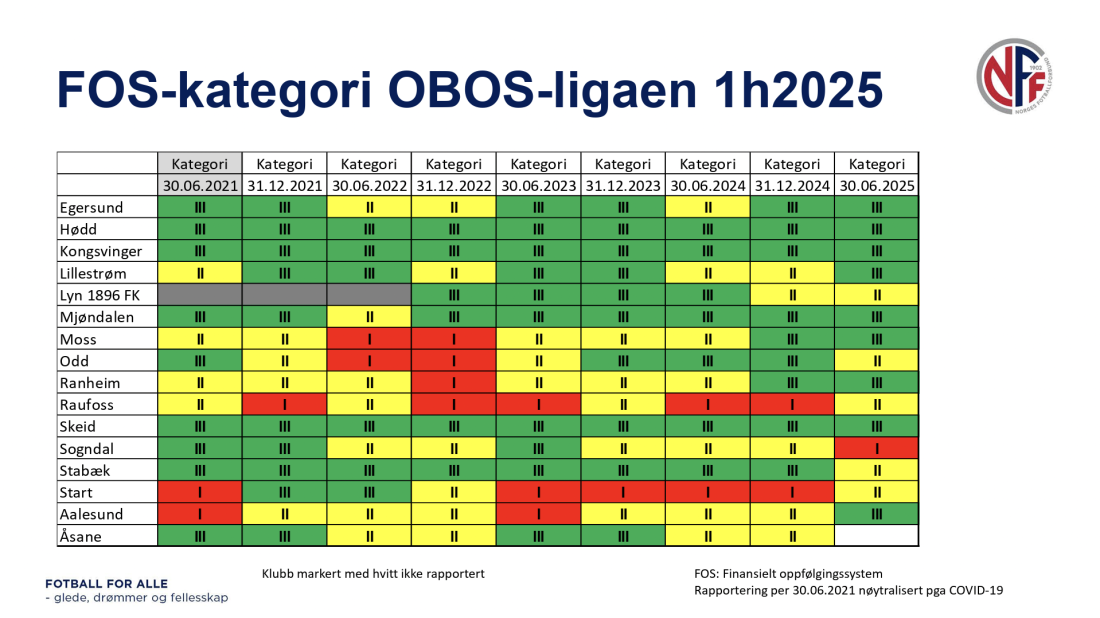 - FOS gir et objektivt syn på den finansielle situasjonen i norske klubber. At Kongsvinger igjen rapporterer i grønn sone viser at klubben drives på en bærekraftig måte som styrker klubbens posisjon overfor potensielle samarbeidspartnere og bidrar til større stabilitet og forutsigbarhet, tilføyde han.