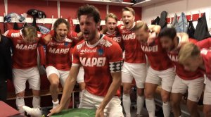 Fredrik Pålerud ledet an "Gi meg en K" i garderoben etter NM-avansementet.